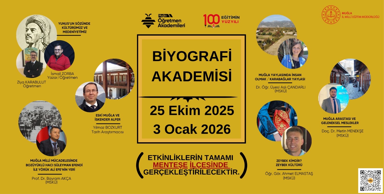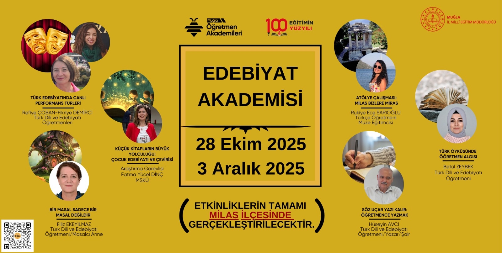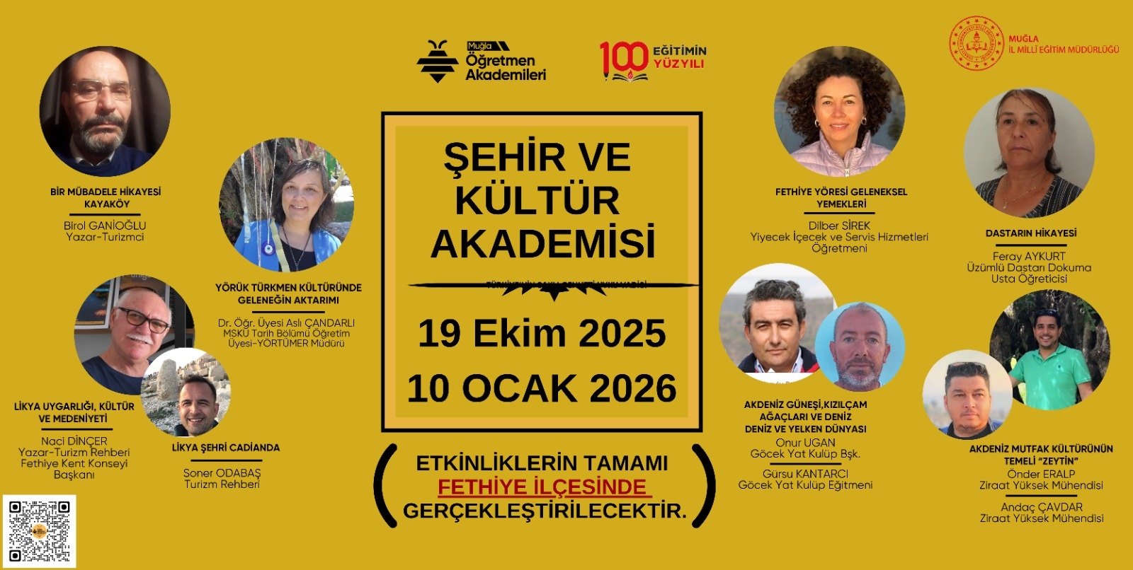 Bakanlığımız tarafından başlatılan ve Müdürlüğümüzce yürütülen "Muğla Öğretmen Akademileri" projesi 2025-2026 eğitim öğretim yılında da devam edecektir. Bu akademilerde, alanında bilgi ve deneyim sahibi uzman kişiler, yazarlar ve duayenler; öğretmen ve yöneticilerimizle tarihi ve kültürel mekânlarda bir araya gelmesi sağlanacaktır.